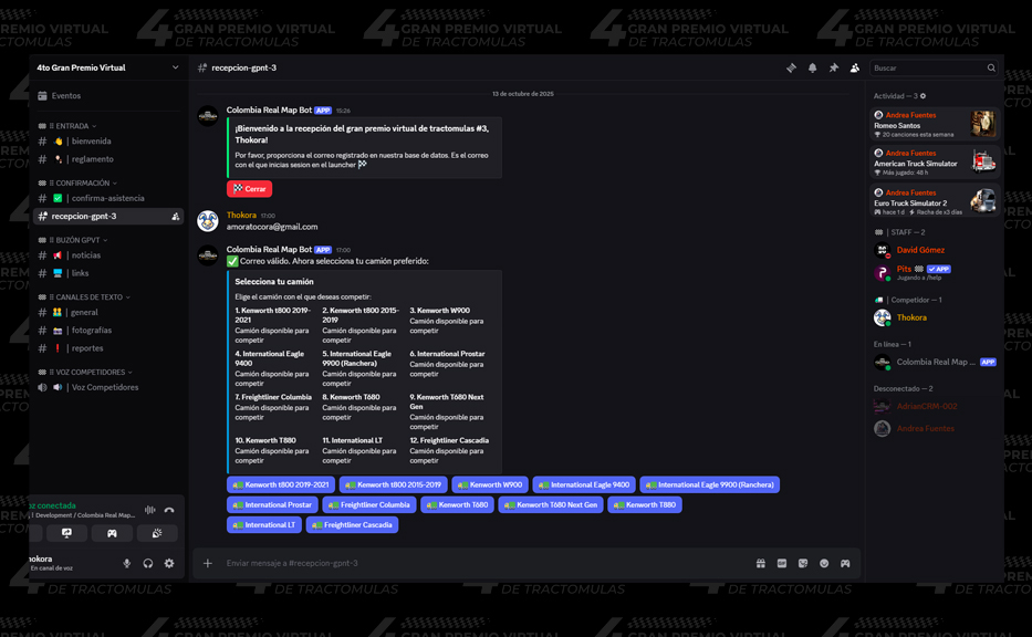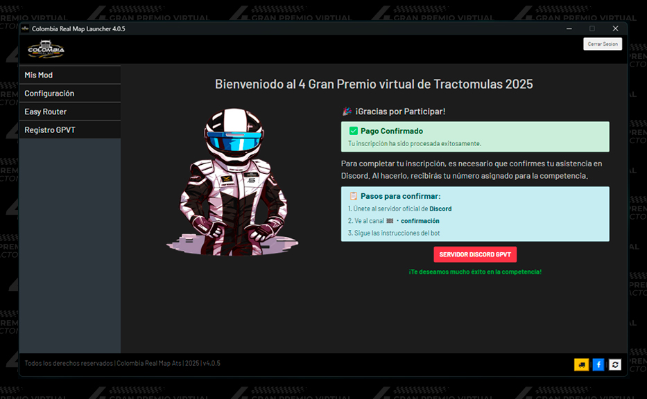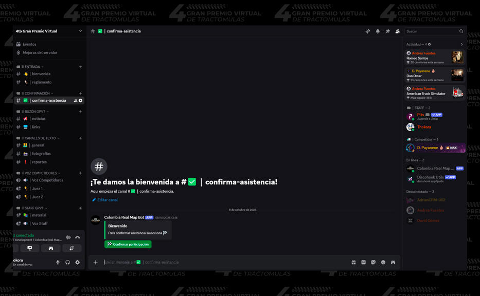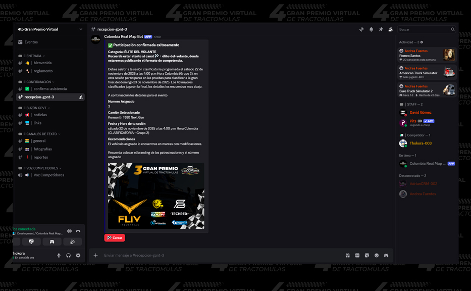 - Discord: Cada competidor deberá contar con una cuenta de Discord para poder recibir las instrucciones en tiempo real de los comisarios de carrera. El canal de Discord oficial será usado para anunciar el inicio de las sesiones, notificaciones importantes y cualquier cambio en las reglas o programación.